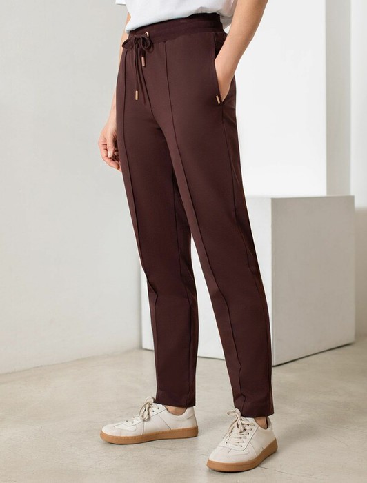 Брюки коричневого цвета зауженного кроя выполнены из премиального футера-двухнитки. Лаконичный силуэт поддерживают застроченные стрелки, зрительно вытягивающие силуэт. Удобный пояс на резинке регулируется хлопковым шнурком с золотистой фурнитурой. Наличие эластана в составе изделия гарантирует комфорт и долговечность изделия. Эластичный материал хорошо пропускает воздух, позволяя телу дышать, и легко тянется, не ограничивая движения.