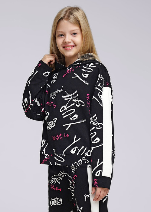 Стильный объёмный свитшот с капюшоном из футера. Набивная модель в сочетании с однотонными вставками по рукаву легко впишется в повседневный лук, сделает твой образ ярким и незабываемым.