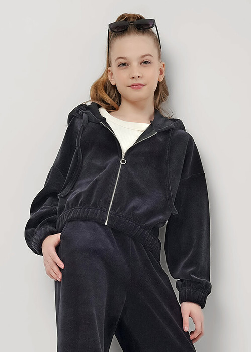 Уютная толстовка из мягкого велюра для девочки. Модель с застёжкой-молнией, свободным силуэтом и удобным капюшоном. Длинные рукава и карманы-кенгуру. Приятный на ощупь материал создаёт комфорт и сохраняет тепло.