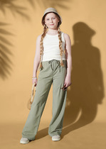 Брюки для девочки из трикотажного полотна. Передние половинки со средними швами; по швам выполнена узкая отделочная строчка. Верхний срез изделия обработан притачным поясом с эластичной тесьмой внутри.