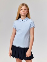 Блузка школьная для девочки с отложным воротником из  трикотажа супрем. Застёгивается на пуговицу и петельку из шляпной резины. Воротник украшен оборкой. Рукава и низ изделия обработаны плоскими швами.