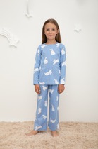 Трикотажная пижама в рубчик из натурального хлопка. Джемпер с длинными втачными рукавами и лосины с эластичной резинкой в поясе. Оригинальная набивка выполнена из стойких текстильных гипоаллергенных красителей. Изделие сохраняет цвет и форму после многократных стирок. Все трикотажные полотна производятся в соответствии с нормами швейцарского сертификата ЭкоТекс.
