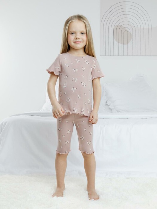Трикотажная пижама в рубчик из натурального хлопка. Футболка с короткими втачными рукавами и шорты с эластичной резинкой в поясе. Оригинальная набивка выполнена из стойких текстильных гипоаллергенных красителей. Изделие сохраняет цвет и форму после многократных стирок. Все трикотажные полотна производятся в соответсвии с нормами швейцарского сертификата ЭкоТекс.