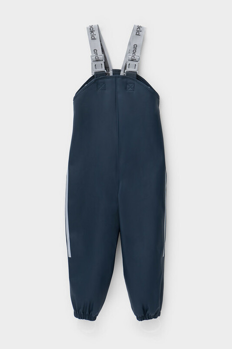 Полукомбинезон без подкладки, непромокаемый, на эластичных  бретелях с регулировкой длины при помощи фастекса, сбоку под проймой кнопки для регулировки объема, низ брючин с эластичной резинкой. Для фиксации полукомбинезона используются съемные силиконовые штрипки. Светоотражающий принт в виде полосы сбоку.