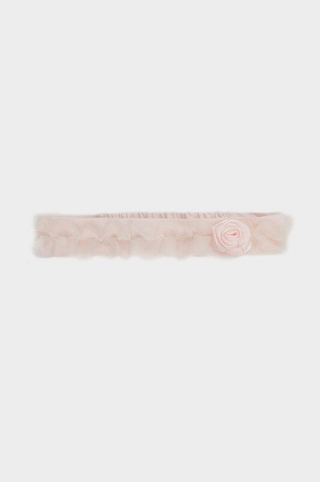 Повязка на голову для девочки из высокачественного хлопкового трикотажа супрем. В области затылка эластичная мягкая резинка. Украшена присборенной рюшей из сетки и декоративной розочкой. Все трикотажные полотна производятся в соответствии с нормами швейцарского сертификата ЭкоТекс.