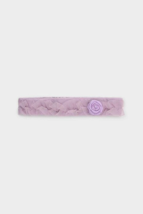 Повязка на голову для девочки из высокачественного хлопкового трикотажа супрем. В области затылка эластичная мягкая резинка. Украшена присборенной рюшей из сетки и декоративной розочкой. Все трикотажные полотна производятся в соответствии с нормами швейцарского сертификата ЭкоТекс.