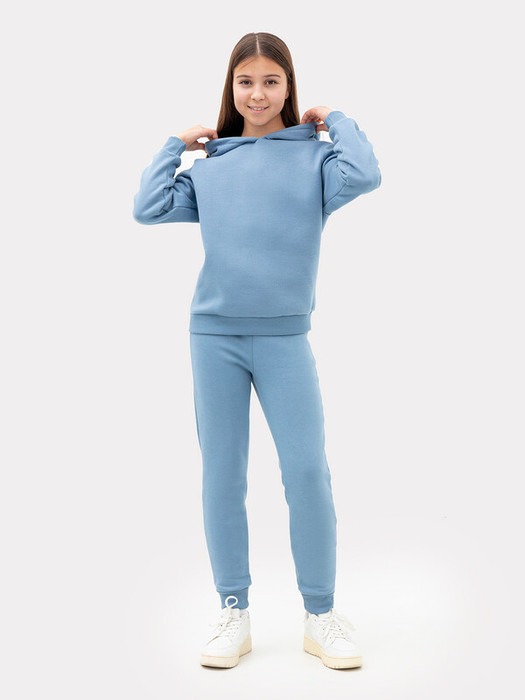 Комплект для самых модных девочек. Выполнен из трикотажного футера без подчеса. Анорак свободного силуэта с капюшоном, спущенной линией плеча, манжетами и поясом из рибаны. Брюки прямого силуэта, с резинкой и регулировочным шнурком в поясе, на манжетах. Уютный комплект!
