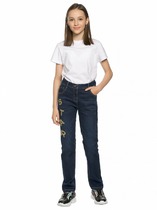 Прямые джинсы для девочек с начёсом из эластичного денима, слим силуэт, металлическая фурнитура, пояс с регулировкой ширины эластичным шнуром. Правая половина декорирована сверкающей аппликацией из страз. Перевод надписи Звезда.