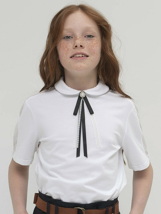 Эластичное кружево по рукаву, круглый воротник с бантом из репсовых и кружевных лент, закрепленный пуговицей с жемчужиной и стразами стильные фишки этой модели. Удобная застёжка сзади воротника позволит легко надеть джемпер и не испортить причёску.
