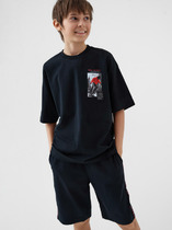 Комплект для девочек футболка и бриджи. Футболка актуального оверсайз силуэта. Спущенная линия плеча, отворот манжета из основной ткани. Стойкий эластичный принт в стиле граффити. Перевод Тот, кто создает правила. Тот, кто нарушает правила. Бриджи расслабленной формы с дополнительной регулировкой объема шнуром и манжетами из основной ткани.
