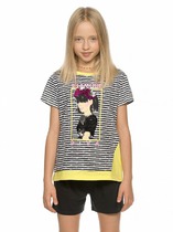 Комплект для девочек футболка и шорты из 100% хлопка. Футболка умеренного объема с мягкой линией плеча. Имитация многослойности - одна футболка, надетая поверх другой. Верхняя полосатая, с ассиметрично срезанным боковым швом и горловиной из рибаны в цвет нижней. Нижняя желтая. Принт с замаскированными в полоски мордочками кота. По центру вышивка из переворачивающихся пайеток и неоновый принт с глиттером, перевод Гламурная дива. Футболка с актуальными трендами сезона для самых продвинутых девчонок.   Шорты умеренного объёма с защипами у пояса. Регулировка объема внутренним шнуром. Комплект можно носить по отдельности и это делает его универсальным.