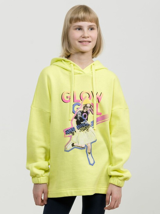 Свободное удлиненное худи оверсайз силуэта из футера с начесом. Сильно спущенное плечо, широкий рукав на манжете с внутренней широкой резинкой. Капюшон двухшовный с люверсами и утяжкой в виде шнурка с новой обработкой концов. Принт в ярких неоновых цветах с градиентом и элементами граффити. Перевод Светящаяся девушка.