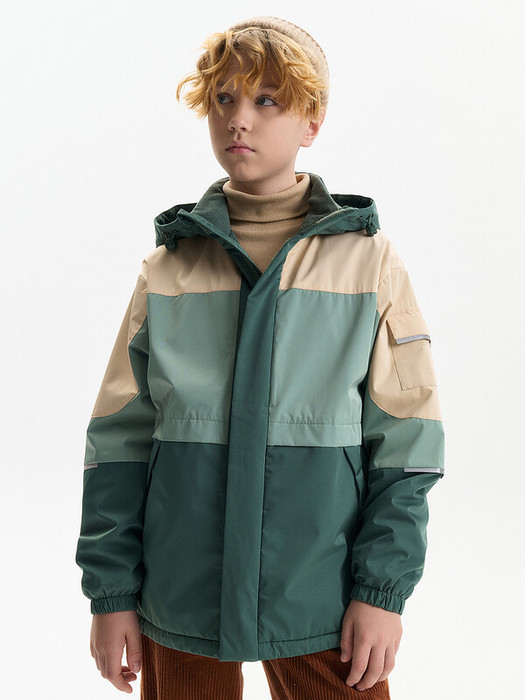 Ветровка с капюшоном. Двухшовный глубокий капюшон с козырьком из светоотражающего материала обеспечивает защиту от ветра и дождя и повышает безопасность в условиях низкой видимости. Прочная тракторная молния с защитой подбородка и удобным пуллером, что делает процесс застегивания максимально удобным для ребёнка. Под молнией ветрозащитная планка.