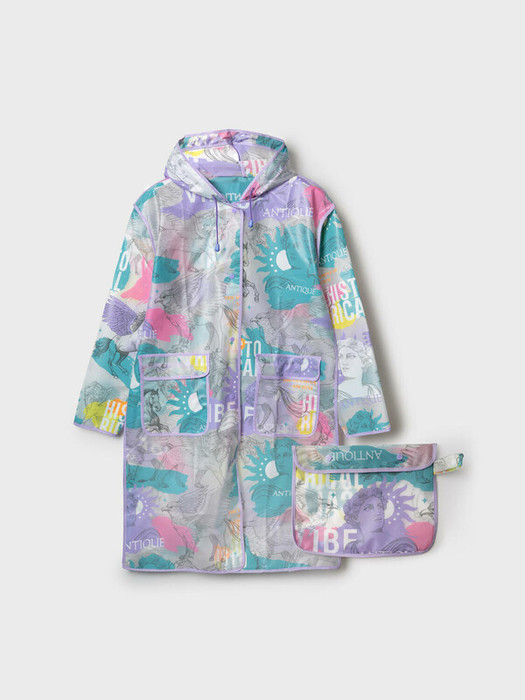 Плащ-дождевик для девочки-подростка с фирменным принтом в коллекцию. Капюшон с утяжкой. Застежка на кнопки. Материал ЭВА. Без подкладки. Модель имеет спереди два накладных кармана с клапаном. Добавлена петелька под капюшоном с внешней стороны, чтобы остальные вещи на вешалке не намокали. Сзади есть светоотражающая полоска. Модель идеально сочетается с резиновыми сапогами и зонтом из коллекции. Идеально подходит для парного образа мама-дочь, так как такая модель есть в размерах для взрослых. В комплекте идет непромокаемая сумочка.