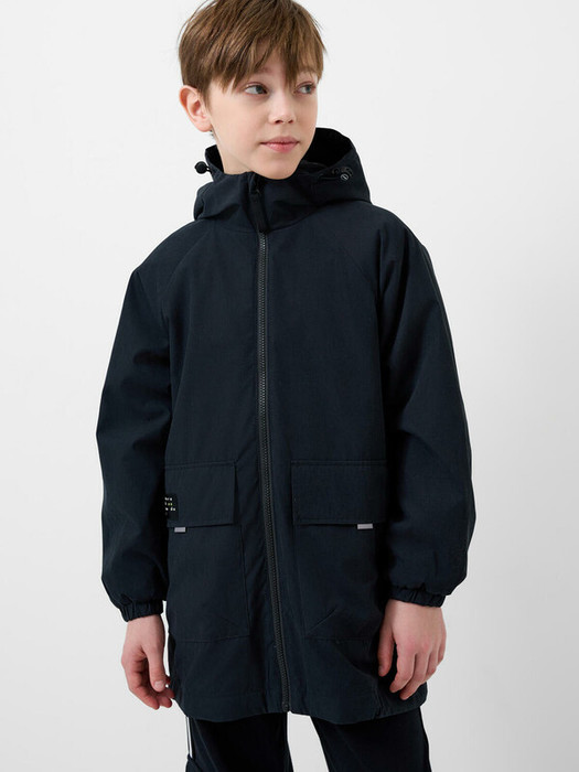 Удлинённый чёрный плащ для мальчика подростка. Температурный режим до 10С. Ткань с ветрозащитной и водоотталкивающей пропиткой. Внутри — подкладка из флиса. Капюшон с утяжкой стопперами. Два удобных боковых кармана с молниями и липучками. Манжеты с мягкими резинками. Внизу есть утягивающий шнур с фиксатором. Светоотражающие элементы.