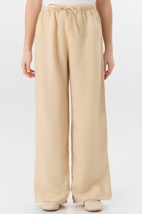 Эти брюки для девочек прямого силуэта — практичный и стильный элемент гардероба! Средняя посадка и пояс с эластичной тесьмой внутри обеспечивают удобную и надежную посадку. Шнур из основного материала, втянутый через пробитые петли на поясе, позволяет отрегулировать объем, добавляя функциональности. Низ брюк обработан швом вподгибку, что делает модель аккуратной и долговечной. Изделие выполнено из сочетания льна и вискозы — материалов, которые отлично дополняют друг друга. Лен обеспечивает воздухопроницаемость и легкость, а вискоза добавляет мягкость и комфорт, что делает брюки особенно приятными во время носки. Такие брюки идеально подойдут для повседневных образов, прогулок или школьных дней, сочетая стиль и удобство!