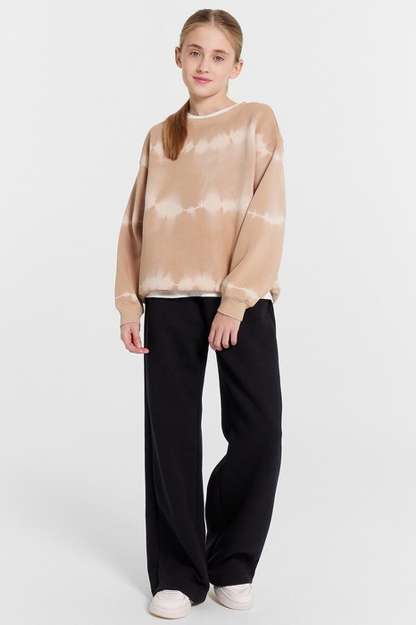 Брюки для девочек, прямого силуэта. Пояс цельнокроеный с втачной эластичной тесьмой RV40. Пояс прострочен двумя отделочными строчками. По переду обработаны карманы в швах. Низ брюк обработан швом в подгибку на двухигольной плоскошовной машине.