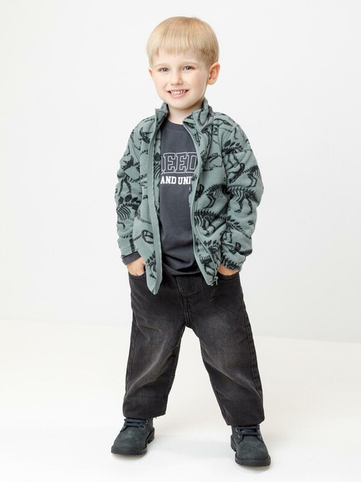 Флисовая куртка для мальчика. У изделия высокий воротник и застёжка на молнию с мягкой защитой шеи и подбородка. По бокам два кармана. Оригинальная набивка выполнена из стойких гипоаллергенных текстильных красителей. Куртка сохраняет цвет и форму после многократных стирок.