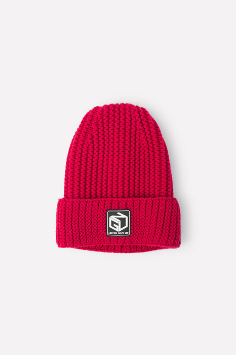 Тёплая вязаная шапка красного цвета для мальчика. На отвороте прикреплена нашивка с надписью и оригинальным рисунком.