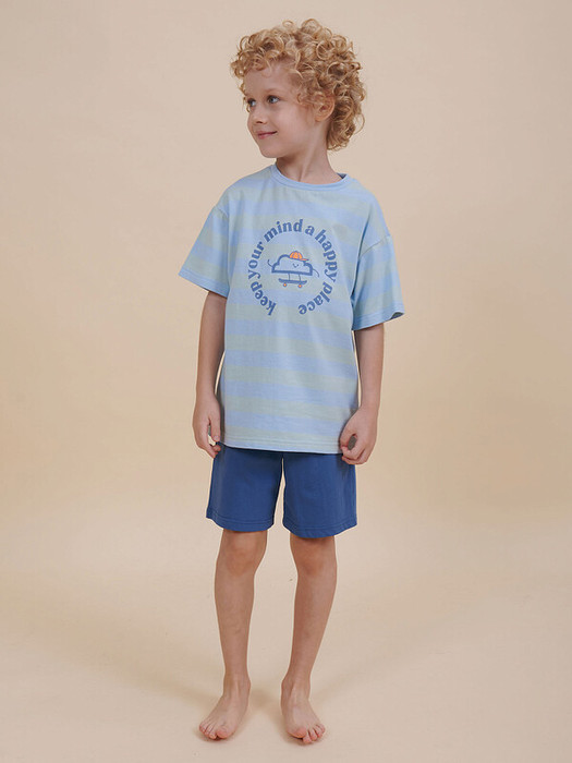Стильная и уютная пижама в скейтерском стиле для мальчика. В составе ткани 100% хлопка — идеально для детской одежды! Модель приятна на ощупь, прекрасно пропускает воздух, позволяя коже ребёнка дышать. При этом в пижаме из хлопка ребёнку будет уютно, даже если он сбросит одеяло. Всё это обеспечивает комфортный и качественный сон. Футболка и удлинённые шорты, плечо немного спущено, рукава широкие и свободные — пижама на мальчика очень удобна для сна. Широкая и мягкая резинка в поясе не перекручивается и не давит. Отделка горловины из эластичной рибаны — она не растягивается, ребёнку удобно надевать и снимать пижаму. Шорты однотонные, голубого цвета. Футболку в полоску украшает позитивный принт в виде облачка в бейсболке на скейтборде. Надпись переводится: "держи свой разум в счастливом месте". В линейке представлены следующие размеры: 1 (86); 2 (92); 3 (98); 4 (104); 5 (110); 6 (116), 7 (122); 8 (128); 9 (134); 10 (140); 11 (146). Хлопковый комплект идеален для сна и отдыха дома — прекрасный выбор для вашего ребёнка! Пижама с шортами для мальчика подходит для круглогодичного использования. Домашний комплект — замечательный подарок сыну, внуку, брату на любой праздник. Выбирайте нужный размер по таблице размеров на фото. Цвет товара на экране вашего устройства может отличаться от цвета изделия вживую.