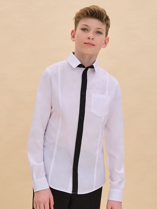 Школьная рубашка для мальчика из практичной ткани с современными деталями. Самые уязвимые для грязи детали выполнены из ткани контрастного цвета. Это разбавляет официальный стиль и позволяет не стирать белую рубашку каждый день.