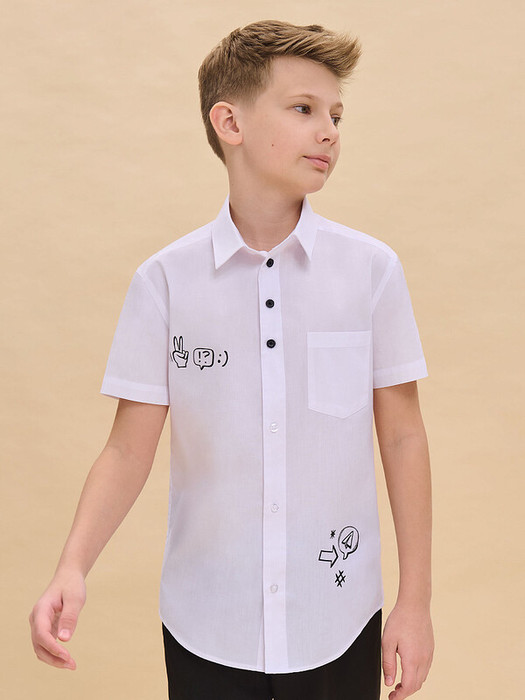 Школьная рубашка для мальчика прямого силуэта подойдет для разных типов фигур. Выдержит любую активность подростка. Ткань мало мнется, хорошо держит форму, а загрязнения легко отстирываются. Дизайн рубашки позволит выделяться и быть модным не только в школе. Заметные акценты- разноцветные пуговицы на планке и принты в стиле инфографики позволяют чувствовать себя стильным и современным.