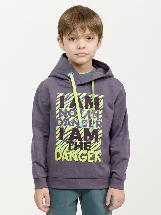 Худи из футера. Плечо мягкое спущенное, углубленная пройма, широкий рукав книзу заужен. Манжеты из рибаны. Капюшон однослойный, с запахом по центру переда. Объем капюшона регулируется неоновым шнуром, на концах которого резиновые уплотнители. Стойкий эластичный неоновый принт. Перевод Я не в опасности, я сам опасность.