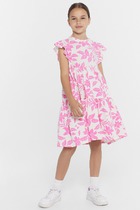 Платье А-силуэта. Короткие рукава-крылышки. В круглую горловину втачана декоративная рюша. По спинке застежка на пуговицу. Платье с двумя отрезными воланами по переду и спинке. Низ изделия обработан швом в подгибку на 2-х игольной плоскошовной машине.