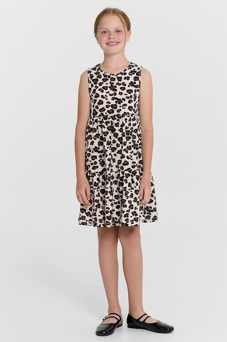 Платье без рукавов, выполненное из легкой трикотажной кулирки. Горловина круглой формы. Нижняя часть платья – с отрезными воланами. Рекомендуем вашей девочке!
