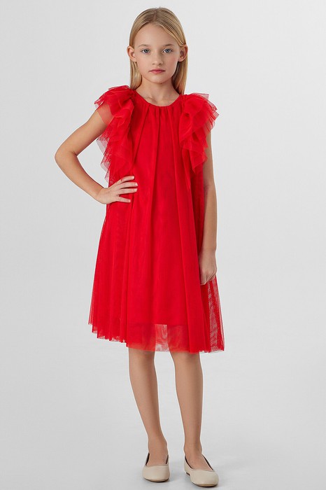Платье А-силуэта. Спинка и перед цельнокройные. Вырез горловины круглый. По спинке застежка-капелька на одну петлю WT4-6 и пуговицу d=10mm. Вдоль верхней части проймы рукава расположено три слоя рюш, которые переходят с переда на спинку. Подкладка из трикотажного кулирного полотна.