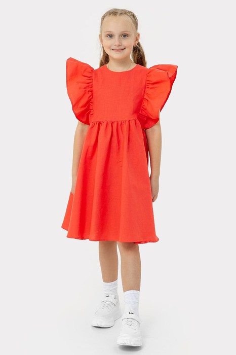 Платье отрезное по линии талии. Горловина круглой формы, обработана обтачкой. По спинке застежка на пуговицу. В рельеф втачаны декоративные рюши. Юбка расширенная со сборкой по талии. Низ изделия обработан швом в подгибку с закрытым срезом.