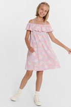 Платье для девочек свободного силуэта на бретелях. По спинке верхнего края платья внутри эластичная тесьма RV20. Платье отрезное по талии, с кулиской. В ней пробиты петли и протянута эластичная тесьма SFKR-1, с фиксаторами SFFKR-1, образуют сборку. По боковым швам накладные карманы с клапаном. Низ платья обработан швом вподгибку.
