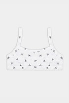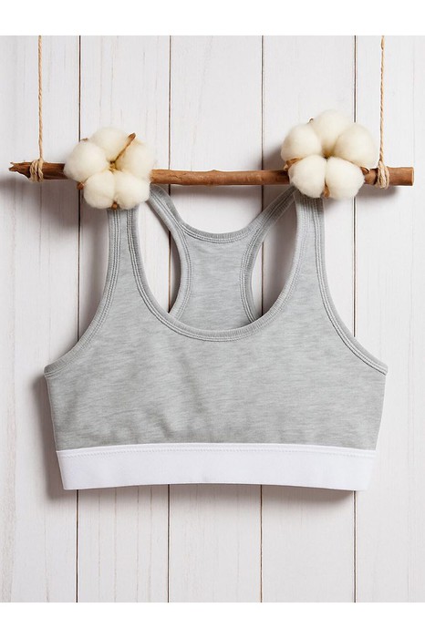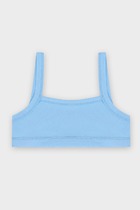 Бюстье из трикотажной кулирки. Горловина округлой формы. Спинка фигурная, как в спортивном топе. Все срезы окантованы бейкой из основного полотна. По нижнему срезу настрочена жаккардовая эластичная тесьма.