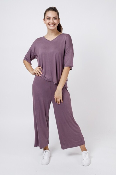 Футболка свободного кроя, спущенное плечо, короткий рукав, в боковых швах обработаны разрезы. V-вырез. Брюки свободного кроя, длина семь восьмых