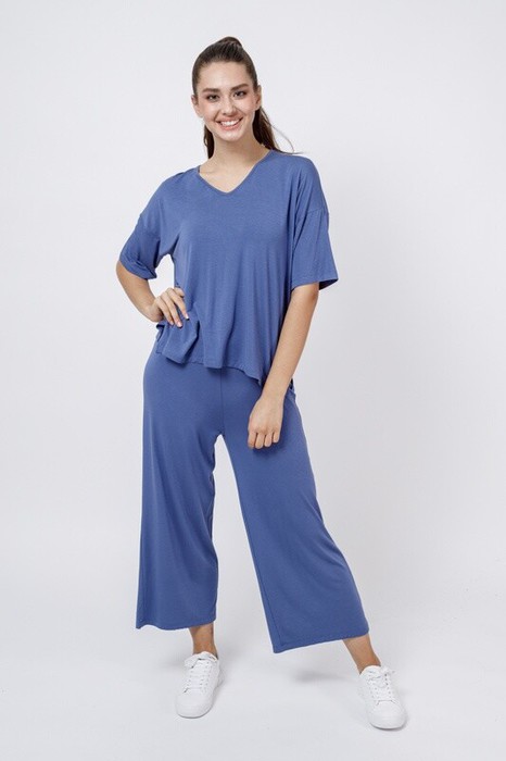 Футболка свободного кроя, спущенное плечо, короткий рукав, в боковых швах обработаны разрезы. V-вырез. Брюки свободного кроя, длина семь восьмых