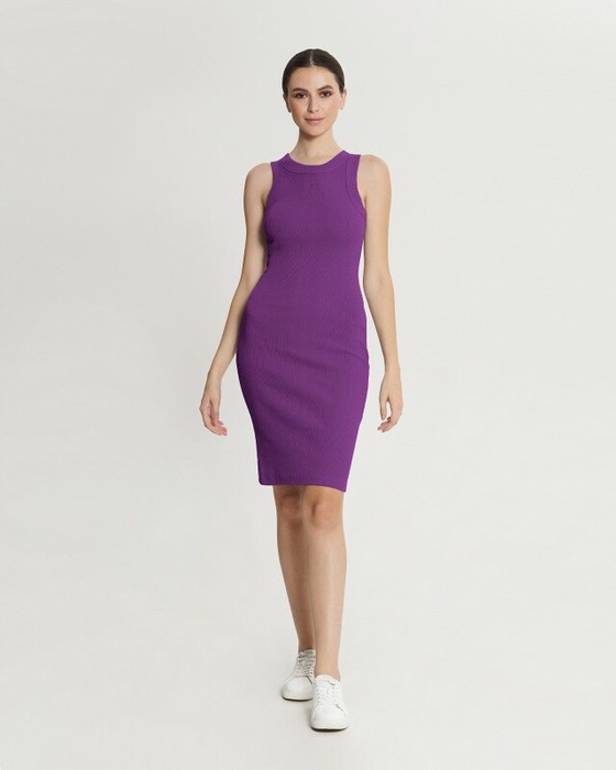 Платье средней длины из кашкорсе, облегающего силуэта, с широкой окантовкой пройм и горловины из рибаны.