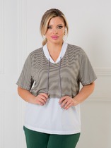 Блузка из вискозного трикотажного полотна, свободного кроя. Длинный втачной рукав,внизу манжет с пуговицей. Отложной воротник, спереди цельнокроеная планка с застежкой на пуговицы, нашивка. На спинке кокетка. По талии съёмный пояс. Фигурный низ изделия.