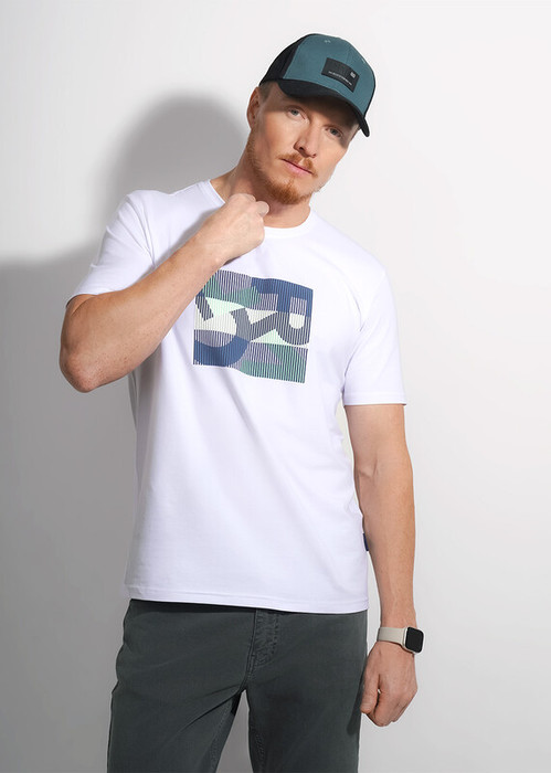 Футболка мужская из хлопкового полотна, круглым вырезом горловины и коротким втачным рукавом. Оригинальность изделию придает графический принт. Хорошо сочетается с джинсами.