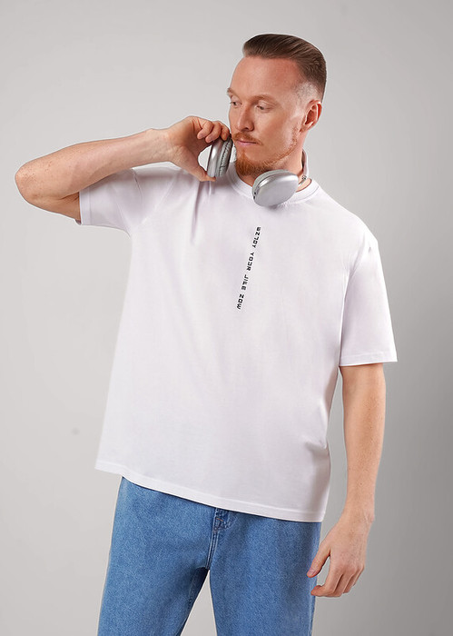 Футболка мужская, увеличенного объема, из хлопкового полотна, круглым вырезом горловины и коротким втачным рукавом. Оригинальность изделию придает дизайнерский принт, а также горизонтальный рез по спинке. Отличный вариант на каждый день.