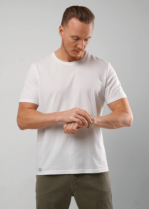 Футболка мужская из фактурного полотна, с содержанием хлопка и полиэстера. С круглым вырезом горловины и коротким втачным рукавом. Оригинальность изделию придает дизайнерская нашивка
