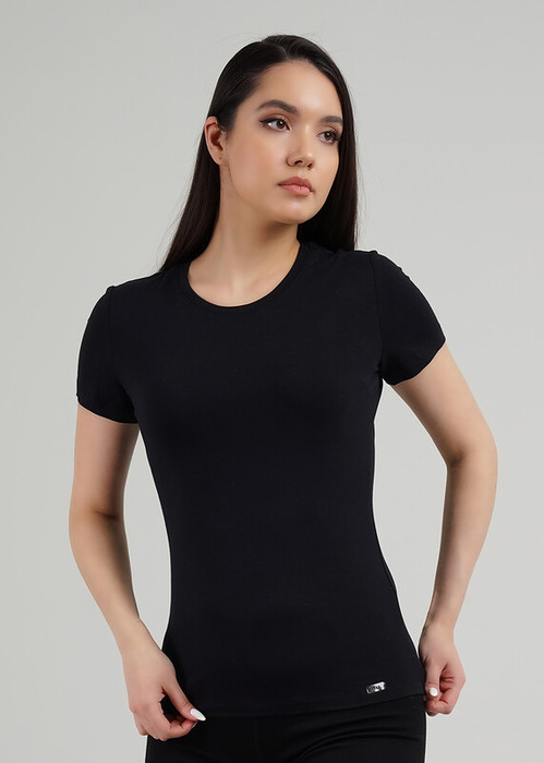 Футболка женская из эластичного полотна с хлопком и модалом в составе. Короткий рукав. Круглый вырез горловины. Фирменный жаккардовый логотип.
