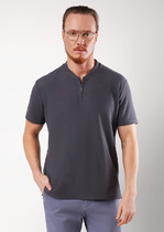 Джемпер с коротким рукавом среднего объема. Воротник отложной вязаный, планка на петли и пуговицы, накладной карман. Низ рукава на вязаной манжете.