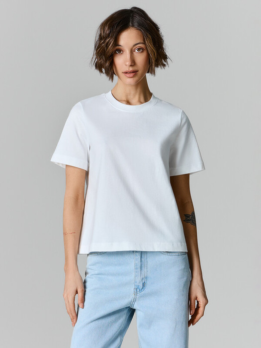 Футболка прямого силуэта из трикотажного полотна кулирка. Горловина круглой формы, широкая обтачка из рибаны.