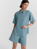 Шорты свободного силуэта, выше колена. По переду заложены складки. По бокам карманы с отрезным бочком. Пояс отрезной, с внутренней резиной 40RV и круглым шнуром 8мм с метал. эглетами (8NMKXWC-1). Низ изделия вподгибку.