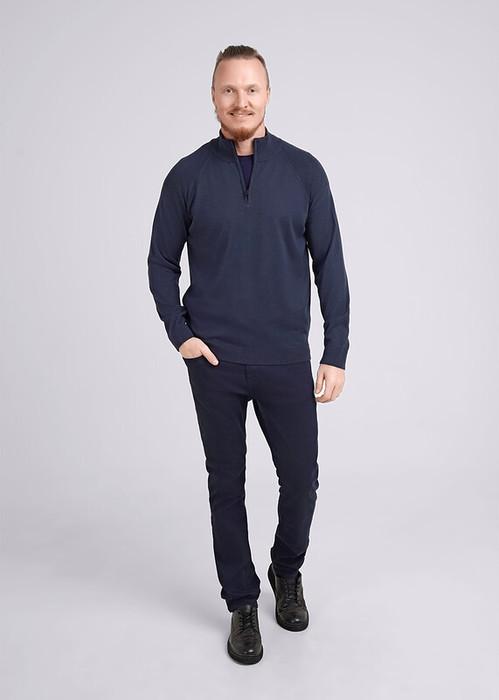 Джемпер мужской с воротником стойкой на укороченной застежке-молнии. Модель изготовлена из смесовой пряжи с добавлением шерсти, прекрасно сохраняет тепло, комфортна в носке. Отличное решение на холодное время года. Комбинируется с джинсами или брюками.