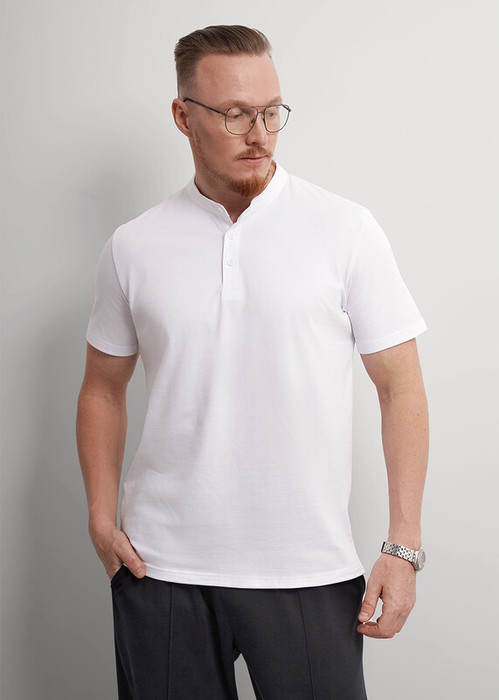 Футболка-поло с воротником-стойка и функциональной планкой на пуговицах, из смесового полотна. Составит отличный комплект с брюками для школы и офиса.