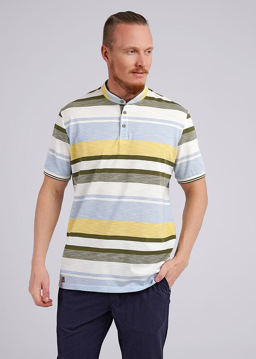 Футболка-поло из дышащего хлопкового полотна флам-пике с вязаными деталями и воротником-стойка, с функциональной планкой на пуговицах. Изделие дополнено боковыми разрезами. Отличный вариант на каждый день.
