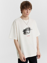 Фуфайка с коротким рукавом среднего объема, круглым вырезом горловины, которая оформлена обтачкой из рибаны, выполненная из набивного полотна.