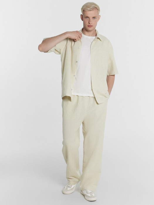 Брюки прямые, посадка средняя. Пояс отрезной с эластичной тесьмой внутри. По переду пробиты петли и втянут шнур-бейка из основного полотна с застроченными концами. В боковых швах обработаны карманы. По переду обработан гульфик с супатной застежкой на петли и пуговицы. На задней правой половинке накладной карман. Нижние срезы брюк обработаны швом вподгибку.