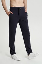 Брюки прямые, свободные. Пояс отрезной с эластичной тесьмой внутри. С внешней стороны пояса пробиты петли и втянут шнур (8КXW-1  8мм) с узлом на концах. В боковых швах обработаны карманы, подкладка кармана из основного полотна. На левой передней половинке проложена декоративная строчка - имитация гульфика. На задней правой половинке накладной карман. Нижние срезы брюк обработаны швом вподгибку с эластичной тесьмой внутри.
